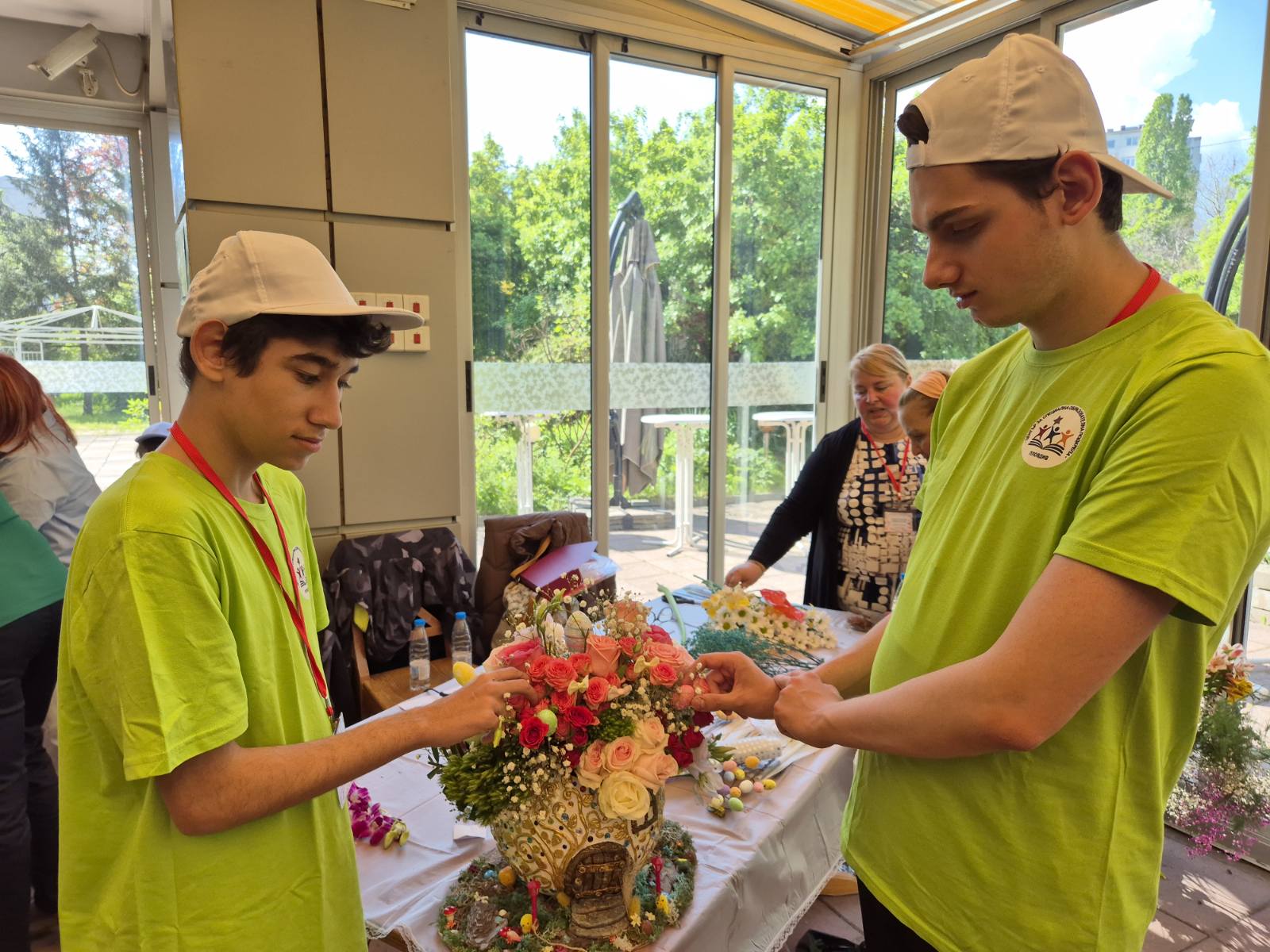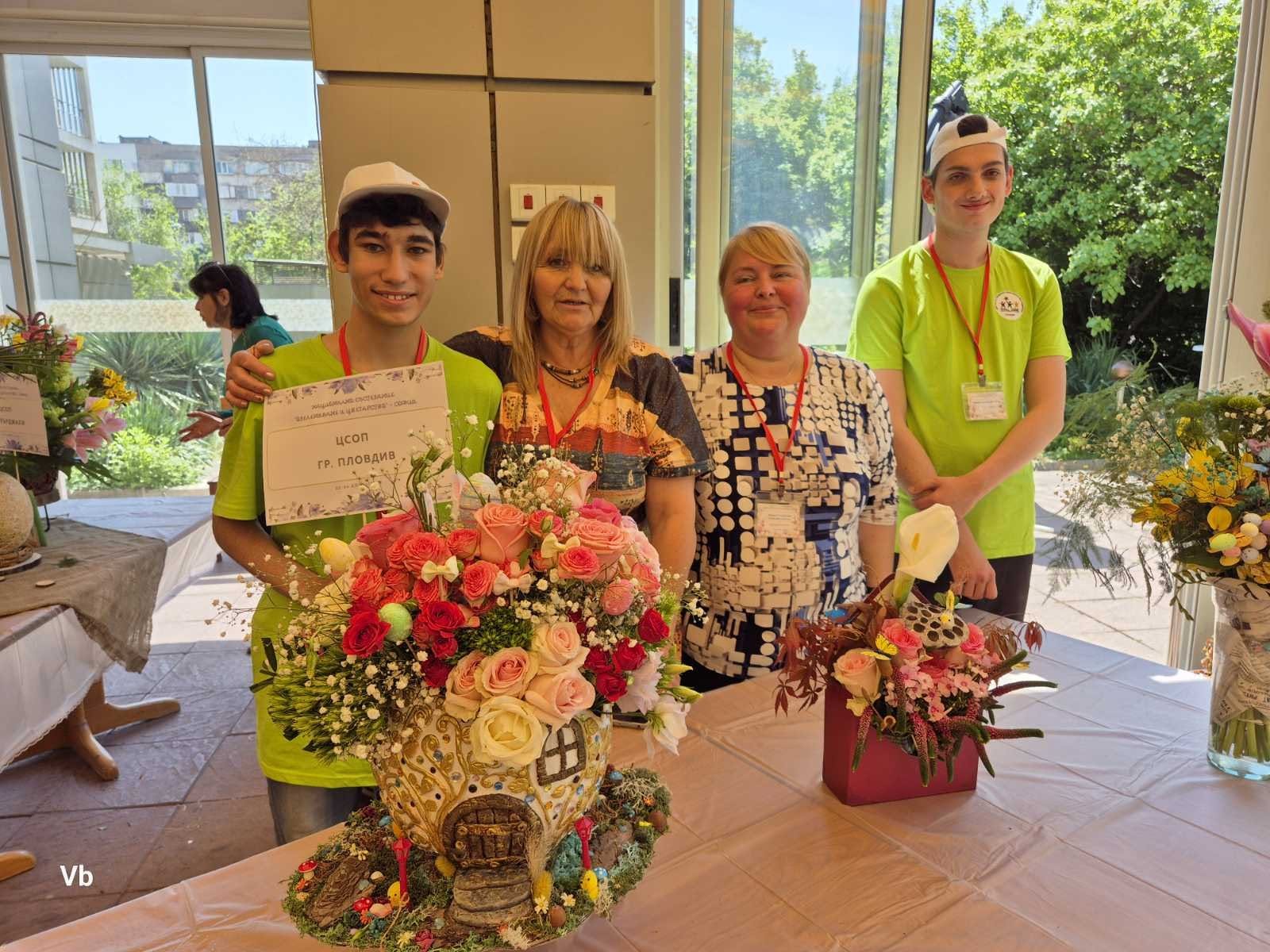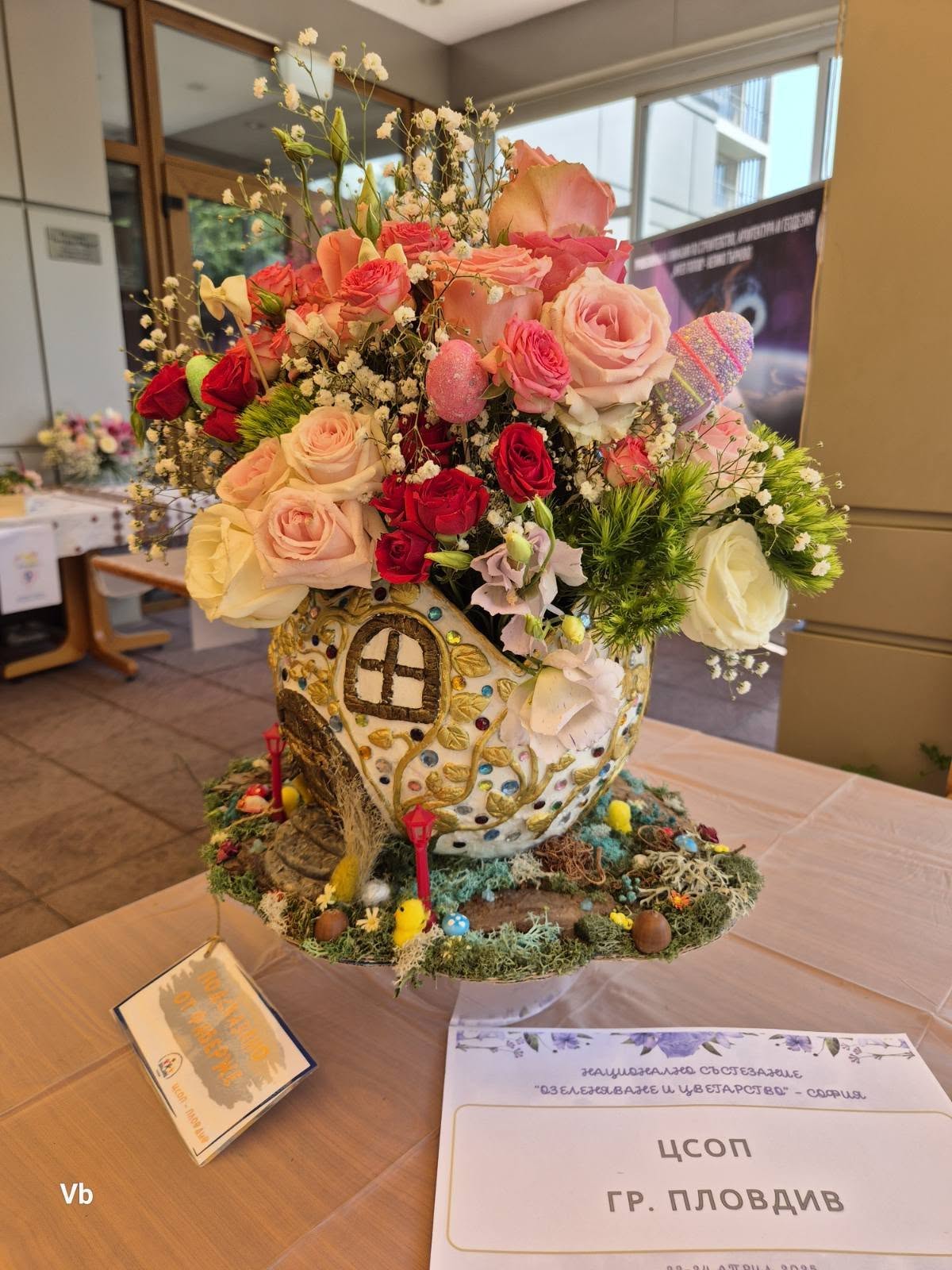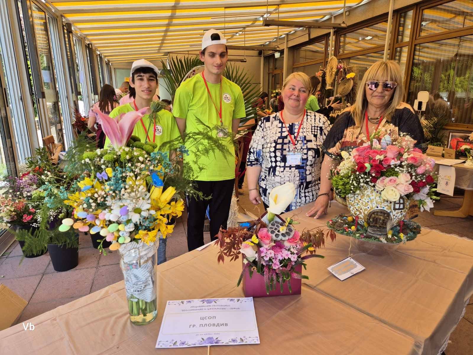 За участниците от трите центъра за СОП състезанието се проведе в две категории: „Букет микс“ и „Кошница/кутия с цветя“ . Освен в тези категории, нашият отбор се включи и с арт-инсталация „Подсказано от Фаберже“, с което покри част от задължителните изисквания за професионалните гимназии. Журито, съставено от преподаватели от Лесотехническия университет, Института по декоративни и лечебни растения, както и флористи оцени професионалните умения на отборите и заслужено присъди Първо място, златни медали и купа на нашия отбор за отлично професионално и артистично аранжиране на цветята.