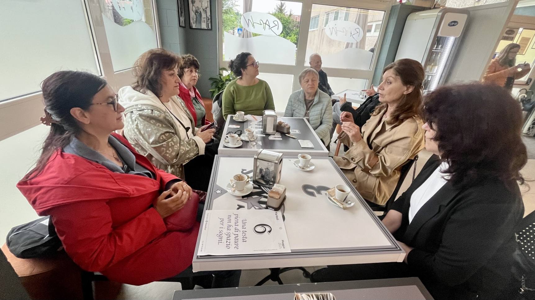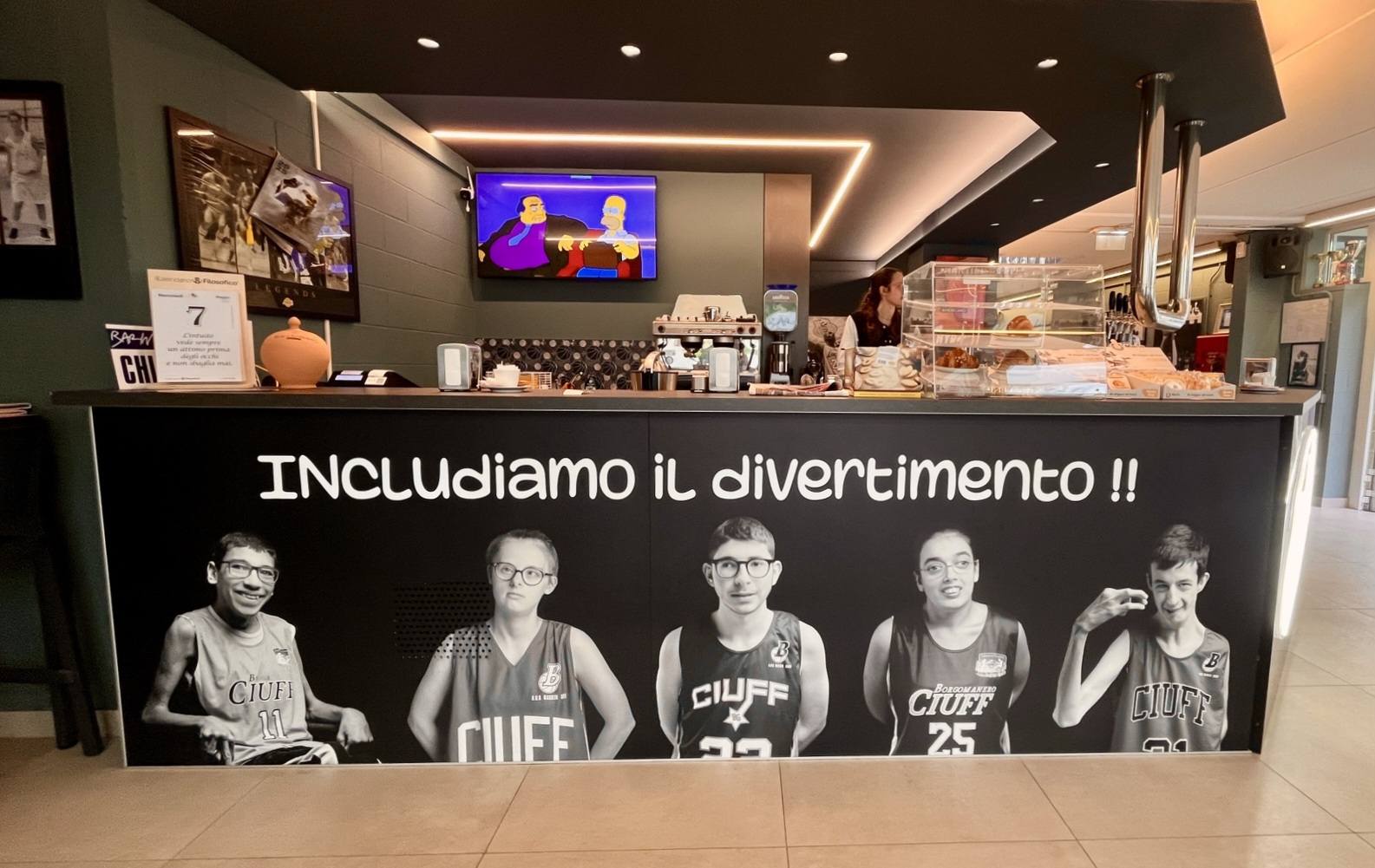 В следобедните часове посетихме кафене Barin, чийто персонал са младежи с леки увреждания. Кафето се намира в Брига Наварезе и е било официално открито преди малко повече от седмица. Идеята за кафенето идва от местния отбор по вече добре познатия ни адаптиран спорт Baskin и навсякъде в заведението има снимки на младите спортисти.