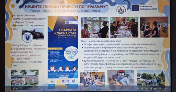 В. Бакиш – директор и Д. Козарев – психолог, представиха темата „Проекти по „Еразъм+“ в подкрепа на приобщаващото образование“ и споделиха важни моменти от работата си по Проект №2024-1-BG01-KA122-SCH-000236636 и първия си проект №2024-1-BG01-KA121-VET-000199919, свързан с присъдената Акредитация на Центъра. Разговорите с колегите участници продължиха и в неформална обстановка – обмениха се добри практики и всеки си „взе“ много нови идеи, които да приложи в ежедневната си работа.
